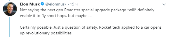 Глава компании Tesla Илон Маск заявил, что новый Roadster может получить некий дополнительный пакет оборудования, который "позволит машине летать". Правда, в переносном смысле.