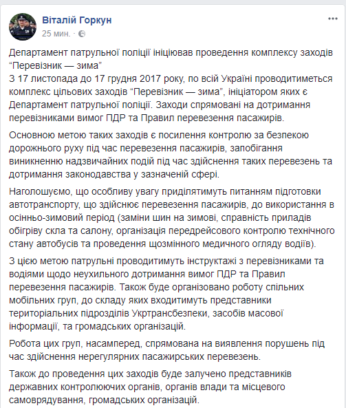 В Украине до 17 декабря, будут проводить усиленный контроль за тем, как водители общественного транспорта соблюдают правила дорожного движения и готовятся к зимнему сезону. Об этом в Facebook сообщил глава Мариупольской патрульной полиции Виталий Горкун.