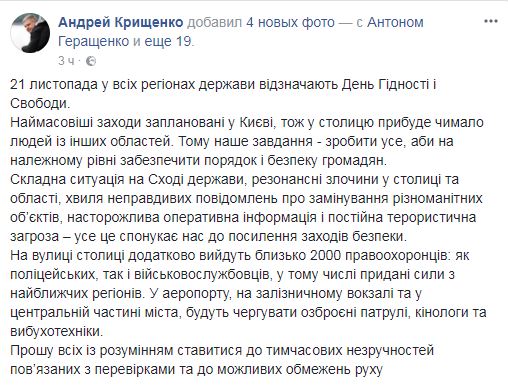 "На улицы столицы дополнительно выйдут около 2000 работников правоохранительных органов: как полицейских, так и военнослужащих, в том числе силы из ближайших регионов. В аэропорту, на железнодорожном вокзале и в центральной части города будут дежурить вооруженные патрули, кинологи и взрывотехники. Прошу всех с пониманием относиться к временным неудобствам, связанным с проверками и к возможным ограничениям движения", - написал Крищенко.