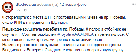 Инцидент произошел около КПИ в направлении Шулявки. Пешеход-нарушитель перебегал проспект Победы через 8 полос и отбойник. Был сбит автомобилем Toyota в третей полосе. С многочисленными травмами пешеход был срочно госпитализирован.