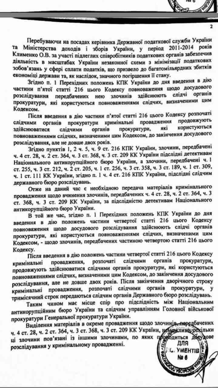 "На данный момент является необходимой передача материалов уголовного производства... по подследственности детективам Национального антикоррупционного бюро Украины", - говорится в документе.