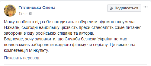"Могу лично от себя согласиться с возмущением известного шоумена. К сожалению, сегодня наибольший интерес для прессы представляет именно вопрос запрета въезда российских певцов и актеров", — написала Гитлянская.