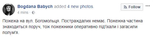 "Пожар на ул. Богомольца. Пострадавших нет. Пожарная часть находится рядом, поэтому пожарные оперативно подъехали и потушили пламя", - пишет она.