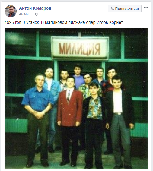Фото сделано в 1995 году в Луганске. На тот момент оперуполномоченный Корнет стоит в красно-бордовом пиджаке в компании людей возле отделения милиции.