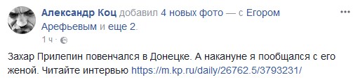 У писателя Захара Прилепина и его жены Марии прошла церемония венчания в Спасо-Преображенском соборе Донецка. Об этом написал журналист Александр Коц на своей странице в Facebook.