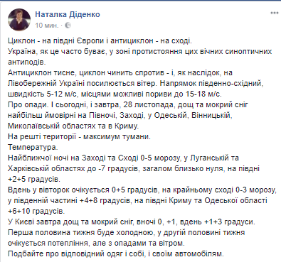 В понедельник и во вторник, 28 ноября, ожидается дождь и мокрый снег. Такая погода будет на Севере, Западе, в Одесской, Винницкой, Николаевской областях и в Крыму.