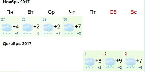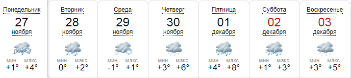 Сайт Weather.com обещает осадки практически всю неделю. В понедельник и среду со снегом. Также 30 ноября утром возможна ледяная изморось. Без осадков только в четверг, 29 ноября. Дневная температура +1...+4. Самым теплым днем недели станет суббота, когда потеплеет до +8.