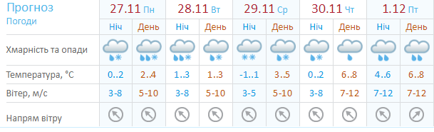 Ресурс Мeteoprog.ua пишет, что единственным днем недели без осадков станет четверг, 30 ноября. В остальные дни - дождь, временами со снегом. Днем +2...+5. В четверг и пятницу до +7...+9.
