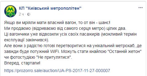 "Если вы мечтали иметь собственный вагон, то вот он - шанс! Мы продаем (отрываем от самого сердца метро) целых два. Эти вагончики уже отвозили всех своих пассажиров (возможный срок эксплуации закончился). Но они с радостью готовы превратиться в уникальный метрохаб, где всегда будет мощный WiFi. Могут стать кнайпой (питейным заведением – Прим.Ред) "Последний жетон" или фотостудией "Не прислоняться". Вперед, стартапы!", - пишет пресс-служба "подземки".