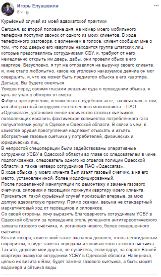 Адвокат Игорь Елуашвили рассказал, что в Одессе группа СБУ пришла с обыском к его клиенту из-за неправильных показателей счетчика на газ. Об этом он написал в Facebook.