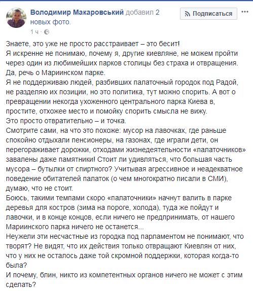 "Знаете, это уже не просто расстраивает – это бесит! Я искренне не понимаю, почему я, равно как и другие киевляне, не можем пройти через один из любимейших парков столицы без страха и отвращения. Да, речь о Мариинском парке. Я не поддерживаю людей, разбивших палаточный городок под Радой, не разделяю их позиции, но это политика, тут можно спорить. А вот о превращении некогда ухоженного центрального парка Киева в, простите, отхожее место и помойку спорить смысла не вижу. Это просто отвратительно – и точка", – написал блогер.