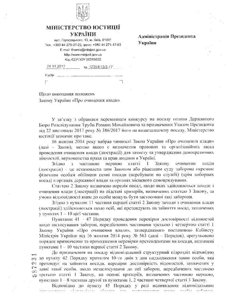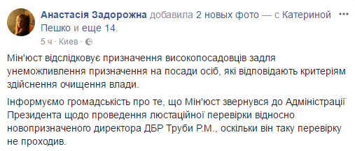 "Информируем общественность о том, что Минюст обратился в Администрацию Президента о проведении люстрационной проверки в отношении нового директора ГБР Трубы Р.М., поскольку он такую проверку не проходил", - написала она.
