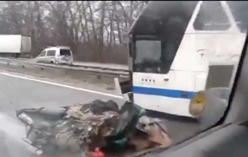 Свидетели сообщают, что на протяжении 100 метров 5 фур, 3 микроавтобуса, 2 легковушки и туристический автобус просто разбросаны по дороге.