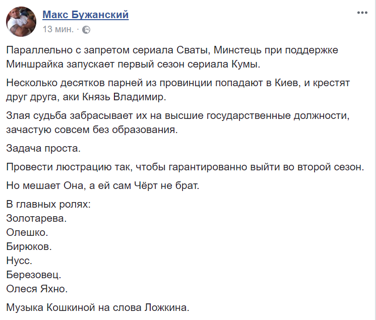 "Госкино запретило все сезоны сериала "Сваты". Надеюсь, Зеленский эту новость воспримет с благодарностью. С благодарностью побратимам, ведь это – инициатива твоих побратимов, которым горланил "слава!". С благодарностью власти майдана, ведь это – решение твоей власти, которую ты возвеличил на майдане. Искренне надеюсь, что Зеленский не остановится на словах благодарности, а ещё – перейдёт на украинский язык: лично, а так же во всех продуктах своего "Квартала". Чтобы радовать своих побратимов ещё больше".