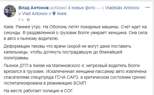 В Киеве на Оболони сегодня рано утром, 30 ноября, пьяный водитель на "Волге" врезался в грузовик, в результате его пассажирка получила критические травмы. Об этом сообщил журналист Влад Антонов в Facebook.
