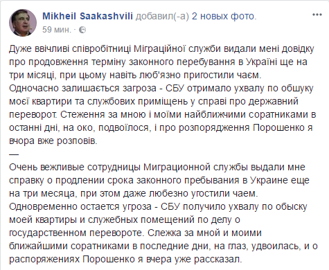 Лидер партии "Рух новых сил", экс-президент Грузии Михаил Саакашвили заявляет, что Миграционная служба Украины выдала ему справку о продлении законного срока пребывания, в Украине на 3 месяца.