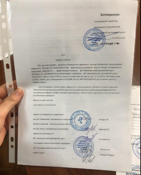 Подтверждение смерти животного удалось получить у заместителя главного ветеринарного врача Кривого Рога. Активисты и журналисты получили заключение о падеже животного. Причина смерти - острая сердечная недостаточность, вызванная эпилепсией.