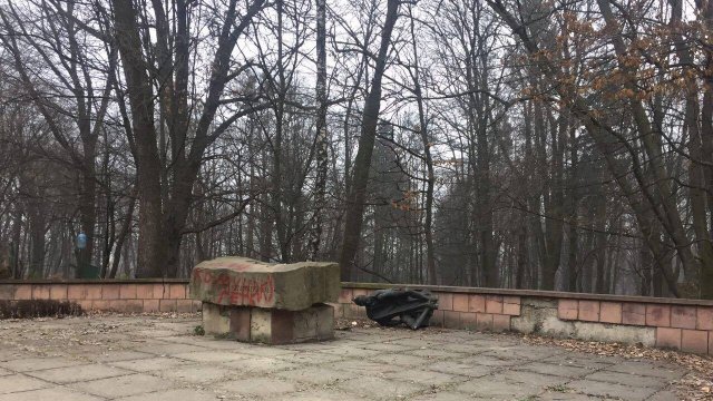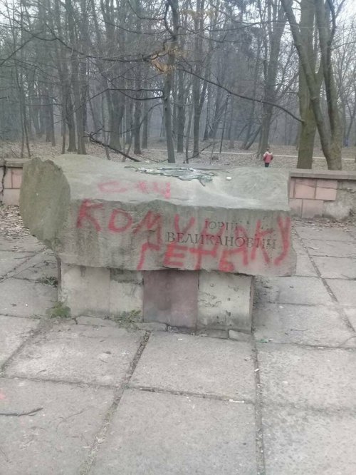 Неизвестные сбросили памятник с постамента, сделали на нем надпись красной краской "Комуняку геть".