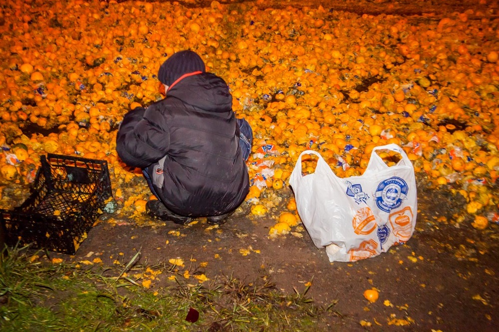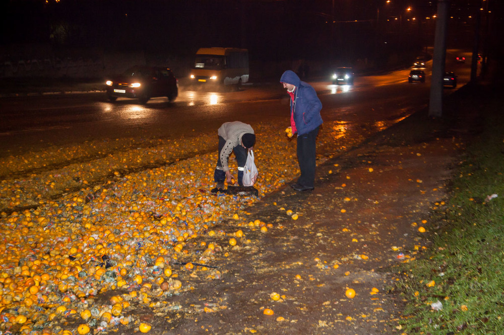 По словам патрульных, на проезде Гальченко произошло ДТП, но участники аварии скрылись с места события, и теперь их разыскивают. Видимо, одним из участников аварии была фура, из которой выпал цитрусовый груз.