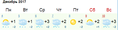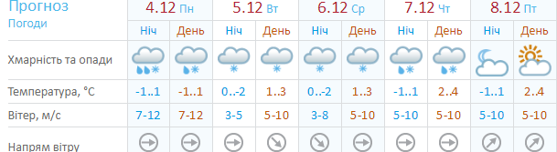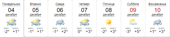 Сайт Sinoptik.ua обещает +1...+3 на неделе и мокрый снег. Солнце проглянет только 8 и 9 декабря - в пятницу и субботу.