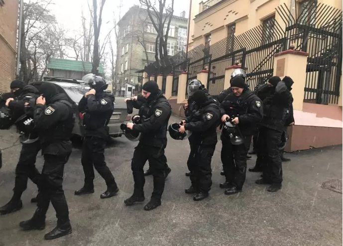 9:34  Народ подтягивается на Костельную, 7 в Киеве. Лестничные пролеты у квартиры №32 заблокированы людьми в шлемах.