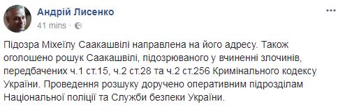 "По достоверной информации Михаилу Саакашвили предъявлены обвинения по статье 256 УК "Содействие участникам преступных организаций и сокрытие их преступной деятельности"", - написал Калныш у себя в Facebook.