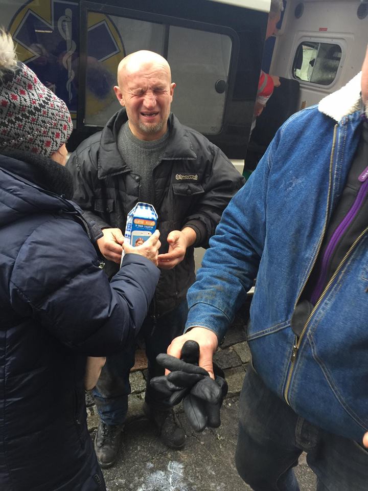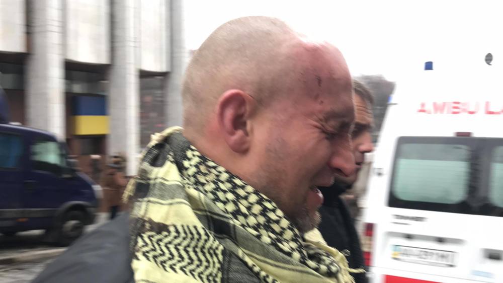 11:24  В карете скорой помощи оказывают помощь одному сотруднику Нацгвардии и одному митингующему, у которого подрезаны пальцы. Только что на моих глазах постращал ещё один активист 70 лет. У него ожог глаз слезоточивым газом. Вот ещё один. Очень много пострадавших.