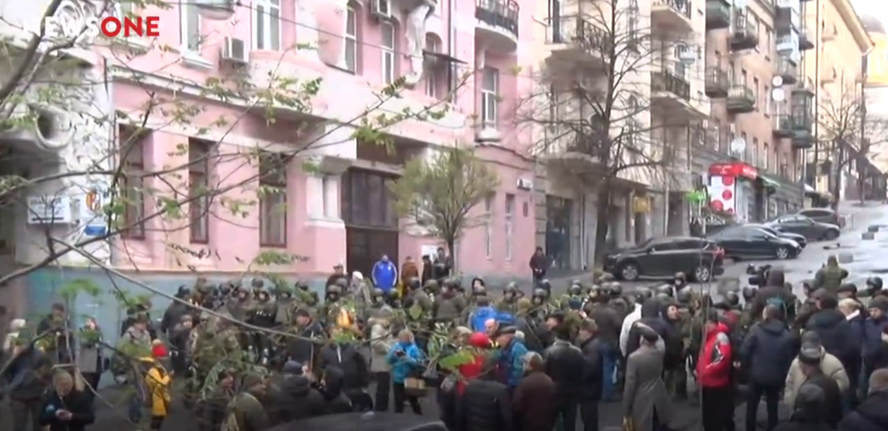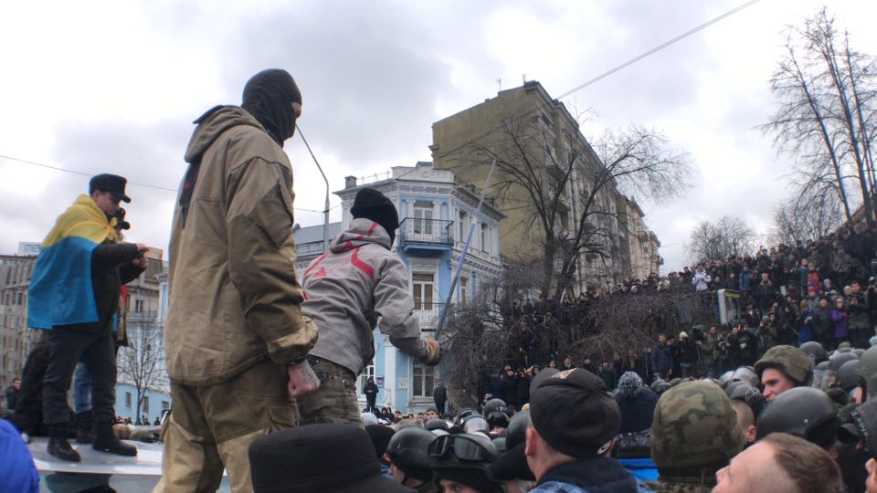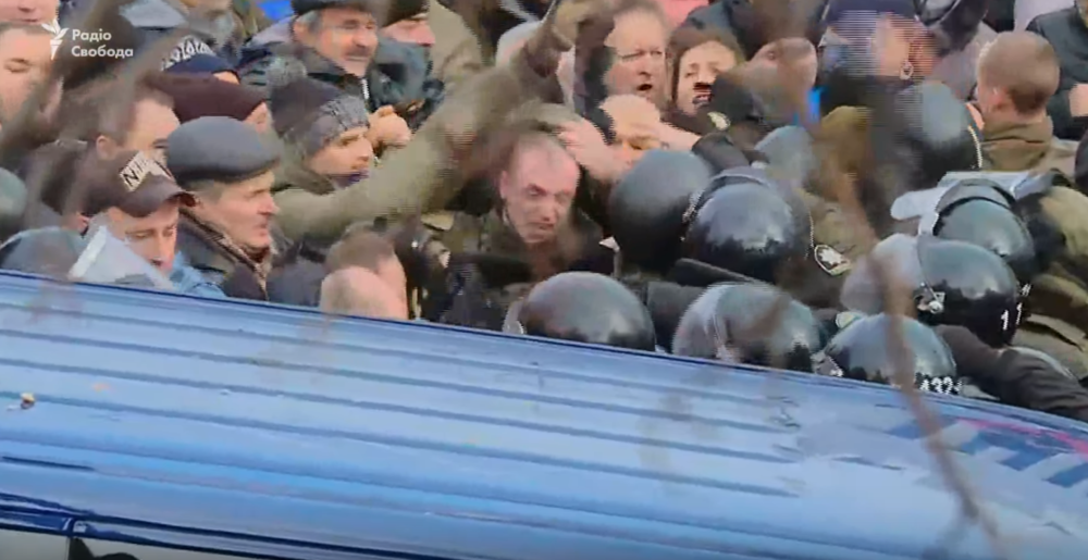 11:15  Полиция начала поливать людей газом. Пара человек пострадали. Активисты пытаются отвечать и что-то бросают. Ведущий образается к начальнику полиции Киева Зозуле и требует отвести силовиков. "Зозуля, забери своих шакалов! Провокатор аваковский!"