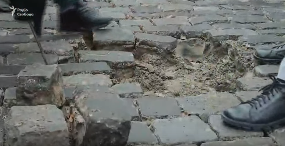 На дороге лежат разбитые бетонные клумбы, которыми перекрывали  дорогу автомобилям СБУ, также снята брусчатка с проезжай части.