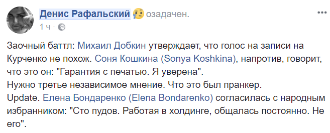 Заочный баттл: Михаил Добкин утверждает, что голос на записи на Курченко не похож. Соня Кошкина (Sonya Koshkina), напротив, говорит, что это он: "Гарантия с печатью. Я уверена".