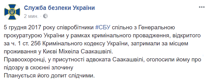 "5 декабря 2017 сотрудники # СБУ совместно с Генеральной прокуратурой Украины в рамках уголовного производства, открытого по ч. 1 ст. 256 Уголовного кодекса Украины, задержали по месту жительства в Киеве Саакашвили.