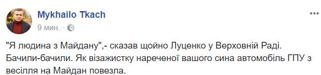 Видели-видели. Как визажистка невесты вашего сына автомобиль ГПУ со свадьбы на Майдан повезла", - написал Ткач в Facebook.