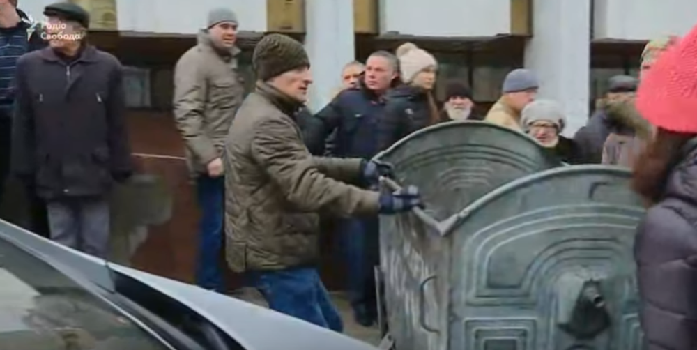 11:58  Тащат мусорный бак, чтобы построить баррикаду.
