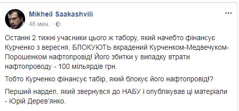 Он также отметил, что "последние две недели участники этого же лагеря, который якобы финансирует Курченко с сентября, блокируют украденный Курченко-Медведчуком и Порошенко нефтепровод".