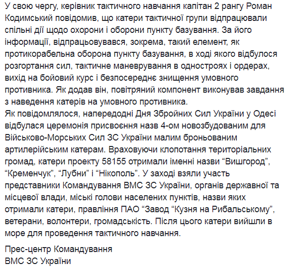В свою очередь, руководитель тактических учений капитан 2 ранга Роман Кодымский сообщил, что катера тактической группы отработали совместные действия по охране и обороны пункта базирования. По его информации, отрабатывался, в частности, такой элемент, как противокорабельная оборона пункта базирования, в ходе которого состоялось развертывание сил, выход на боевой курс, непосредственное уничтожение условного противника.