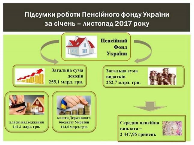 Общая сумма расходов на пенсионные и другие запланированные выплаты составила 252,7 млрд грн (без учета проведенной в декабря 2016 года выплаты пенсий января 2017 в сумме 10,4 млрд грн), что на 32,4 млрд грн больше по сравнению с соответствующим периодом прошлого года.