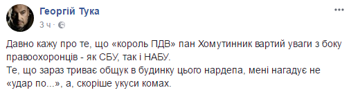 "Давно говорю о том, что "король НДС" господин Хомутынник стоит внимания со стороны правоохранителей - как СБУ, так и НАБУ. То, что сейчас идет обыск в доме этого нардепа, мне напоминает не "удар по ...", а, скорее укусы насекомых", - сообщил Тука.