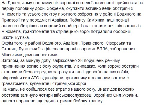 "В общем, с полуночи, российско-террористические войска уже 28 раз нарушили режим прекращения огня. В половине случаев военнослужащие Вооруженных сил Украины отвечали агрессору из гранатометов, крупнокалиберных пулеметов и стрелкового оружия", - сказано в нем.