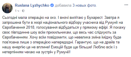 "Сегодня у меня была операция на глазу. И ночью вылетаю в Бухарест. Завтра я приглашена быть в жюри национального отбора участника от Румынии на Евровидение 2018, голосование состоится в прямом эфире", – сообщила Руслана.