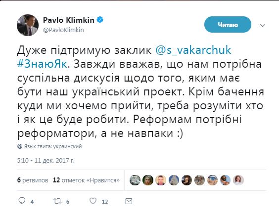 "Всегда считал, что нам нужна общественная дискуссия относительно того, каким должен быть наш украинский проект. Кроме видения куда мы хотим прийти, надо понимать кто и как это будет делать. Реформам нужны реформаторы, а не наоборот", - написал Климкин.