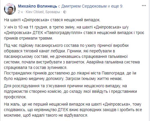 "В ночь с 10 на 11 декабря, в третью смену на шахте "Днепровская" ш/у "Днепровская" ДТЭК "Павлоградуголь" произошел несчастный случай, трое горняков получили травмы", - сообщил Волынец.