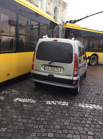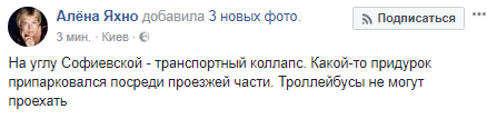 "На углу Софийской - транспортный коллапс. Какой-то придурок припарковался посреди проезжей части. Троллейбусы не могут проехать", - написала Алена Яхно и добавила фото.