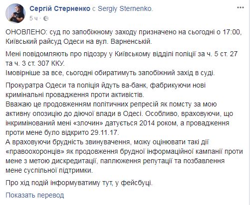 "Считаю это продолжением политических репрессий в отместку за мою активную оппозицию к действующей власти в Одессе", – написал Стерненко в Facebook.