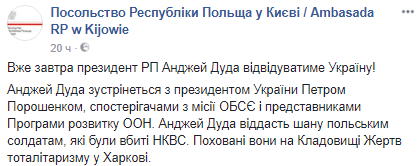 "Президент РП Дуда посетит Украину! Встретится с президентом Украины Петром Порошенко, наблюдателями из миссии ОБСЕ и представителями Программы развития ООН", - говорится в сообщении.