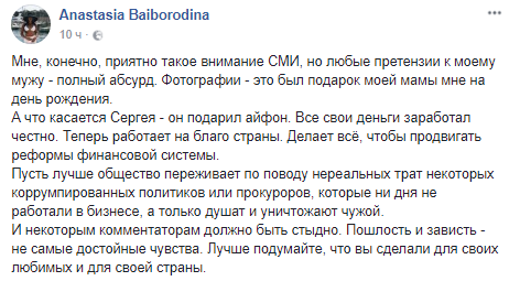 А что касается Сергея - он подарил айфон. Все свои деньги заработал честно. Теперь работает на благо страны. Делает всё, чтобы продвигать реформы финансовой системы", - написала девушка.