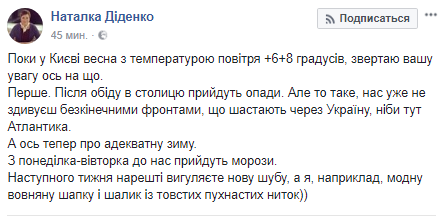 По ее словам, пока в Киеве весна с температурой воздуха +6...+8, но уже 18-19 декабря придут морозы.
