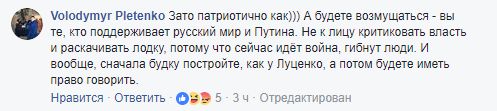 "Зато патриотично как, - скаркастично пишет один из комментаторов. – А будете возмущаться - вы те, кто поддерживает русский мир и Путина. Не к лицу критиковать власть и раскачивать лодку, потому что сейчас идет война, гибнут люди. И вообще, сначала будку постройте, как у Луценко, а потом будете иметь право говорить".