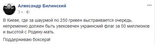 Журналист Александр Билинский с иронией пишет: "В Киеве, где за шаурмой по 250 гривен выстраивается очередь, непременно должен быть увековечен украинский флаг за 50 миллионов и высотой с Родину-мать. Поддерживаю боксера!"