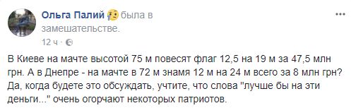 "В Киеве на мачте высотой 75 м повесят флаг 12,5 на 19 м за 47,5 млн грн. А в Днепре - на мачте в 72 м знамя 12 м на 24 м всего за 8 млн грн?