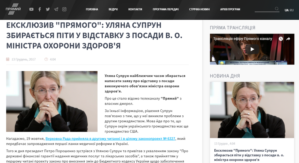 "Решение Супрун связано с тем, что у нее возникли проблемы со вторым гражданством. Речь идет о том, что Супрун кроме украинского гражданства имеет еще гражданство США", - говорится в сообщении "Прямого".